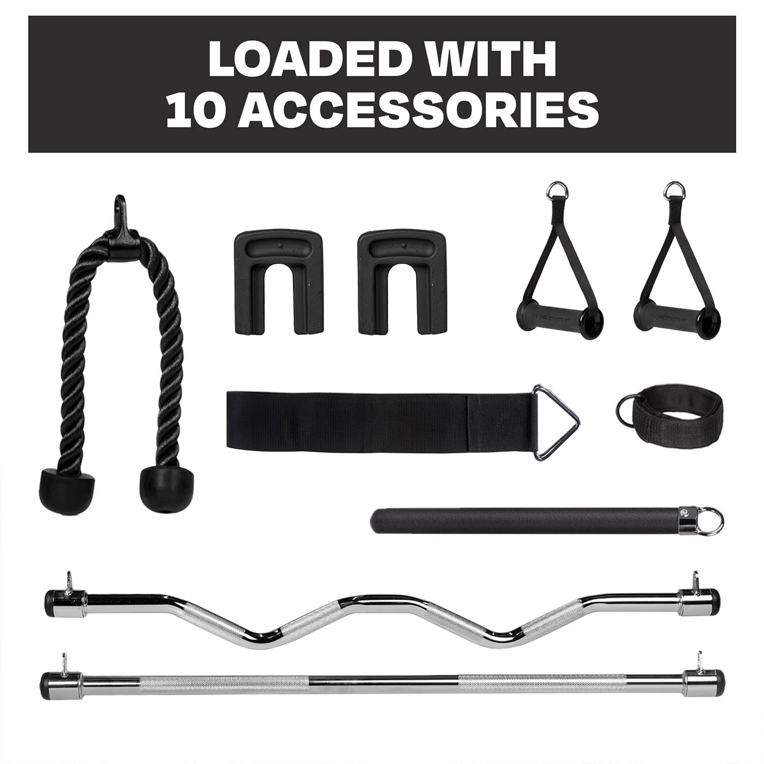 - Multi-functional belt, easy curl bar, straight bar, ankle cuff, swing handle, tricep rope, 2 single handles and 2 x 5lbs add-on weights