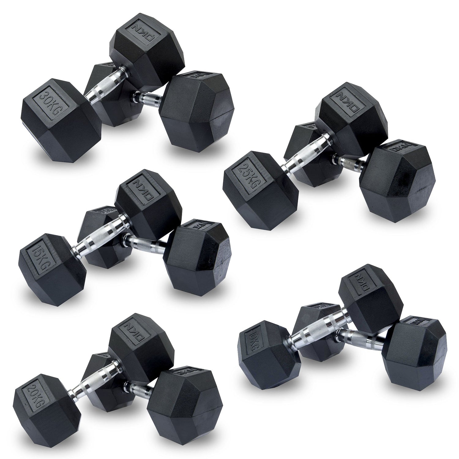 DKN 10kg to 30kg Rubber Hex Dumbbell Set - 5 Pairs