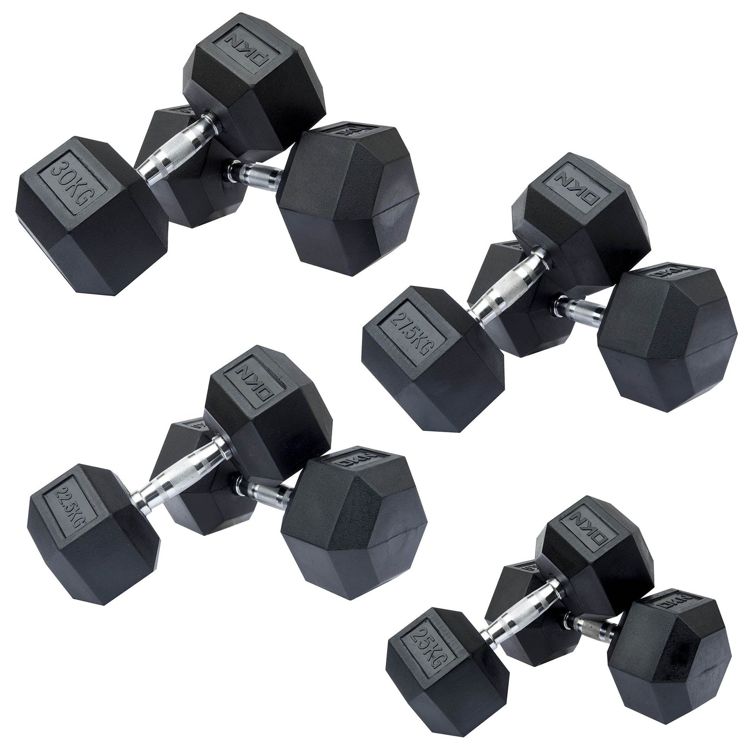 DKN 22.5, 25, 27.5 and 30kg Rubber Hex Dumbbell Set