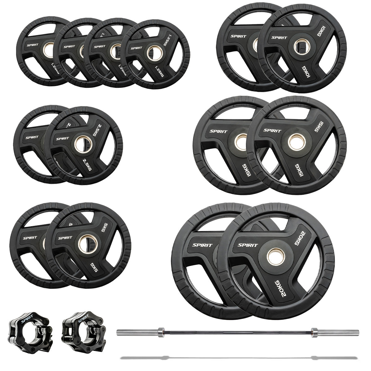 The set includes the Spirit Fitness Olympic rubber tri grip weight plates, the Spirit Fitness 6ft Olympic barbell and the Spirit Fitness Olympic lock jaw collars.