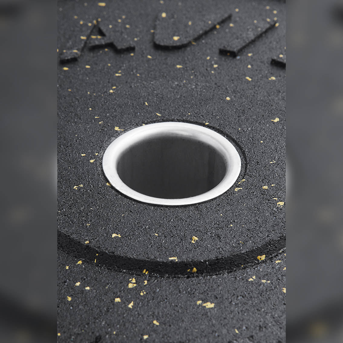 - Centre hole designed with a steel ring to accommodate Olympic bars